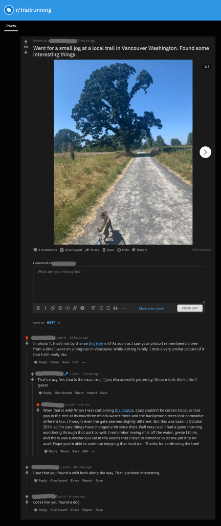 I don’t use Reddit much, but I just had a fun experience on the r/trailrunning subreddit. Sometimes folks share photos from their run. Yesterday, someone posted a few photos from a local trail of theirs they had explored. The first photo featured a tree that I immediately felt looked familiar. I’d seen a very similar tree and had taken a very similar photo a few years back during a random long run while visiting my parents in Vancouver, Washington. I had to find out if it was the same tree.
